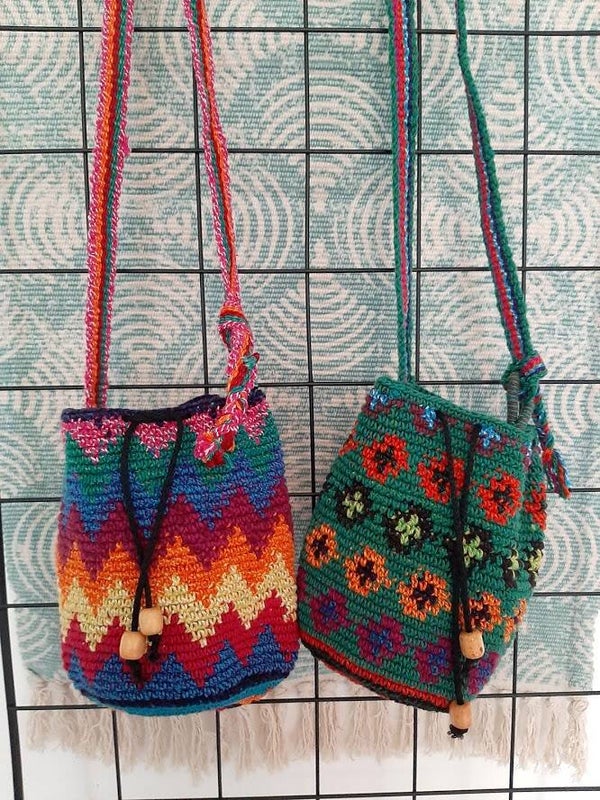 Superleuk gehaakt tasje met trekkoord om te sluiten. De vrolijke kleurtjes geven je gelijk een vakantiegevoel!